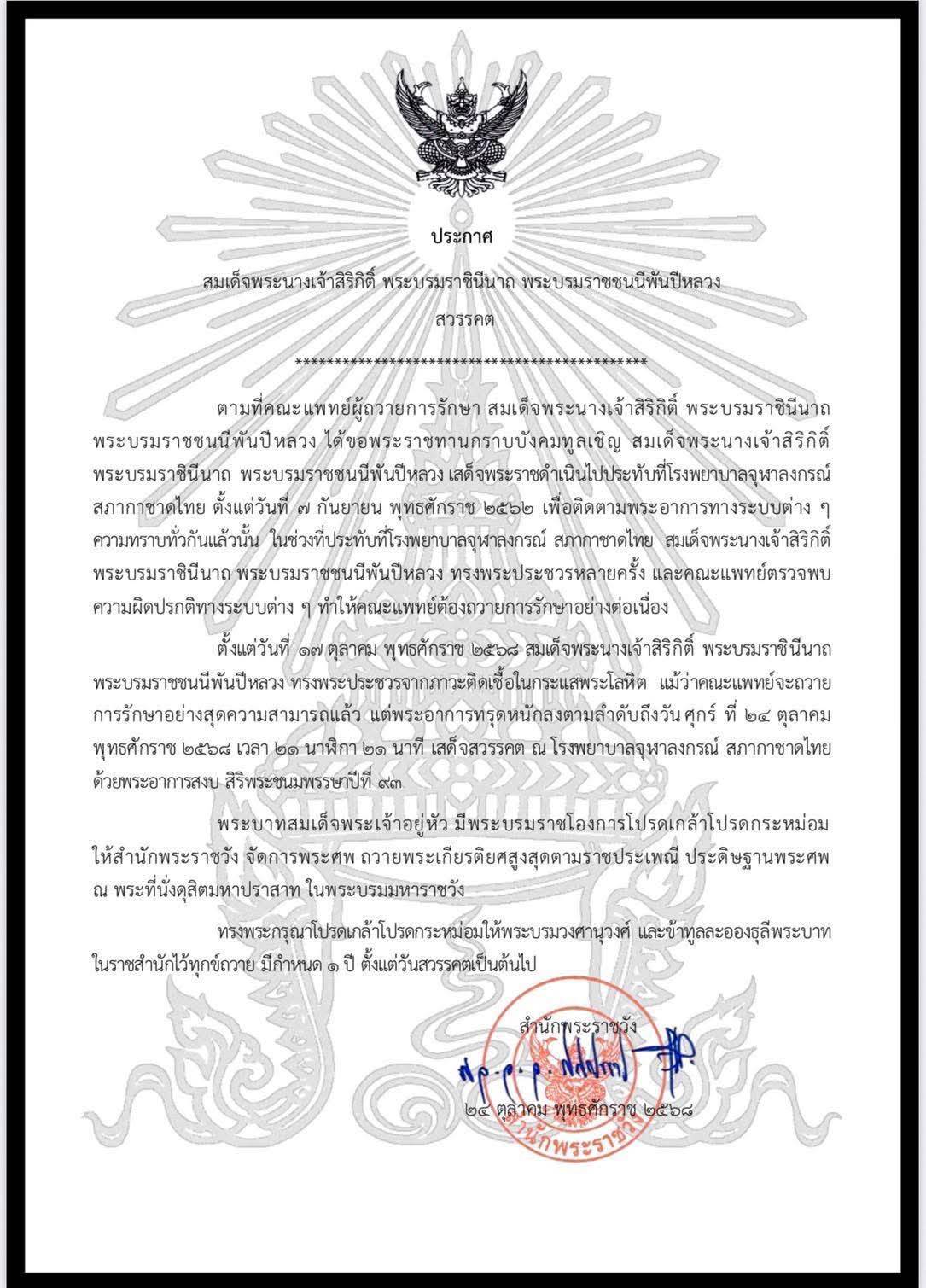 ตั้งแต่วันที่ ๑๗ ตุลาคม พุทธศักราช ๒๕๖๘ สมเด็จพระนางเจ้าสิริกิติ์ พระบรมราชินีนาถพระบรมราชชนนีพันปีหลวง ทรงพระประชวรจากภาวะติดเชื้อในกระแสพระโลหิต แม้ว่าคณะแพทย์จะถวายการรักษาอย่างสุดความสามารถแล้ว แต่พระอาการทรุดหนักลงตามลำดับ ถึงวันศุกร์ ที่ ๒๔ ตุลาคม พุทธศักราช ๒๕๖๘ เวลา ๒๑ นาฬิกา ๒๑ นาที เสด็จสวรรคต ณ โรงพยาบาลจุฬาลงกรณ์ สภากาชาดไทย ด้วยพระอาการสงบ สิริพระชนมพรรษาปีที่ ๙๓
