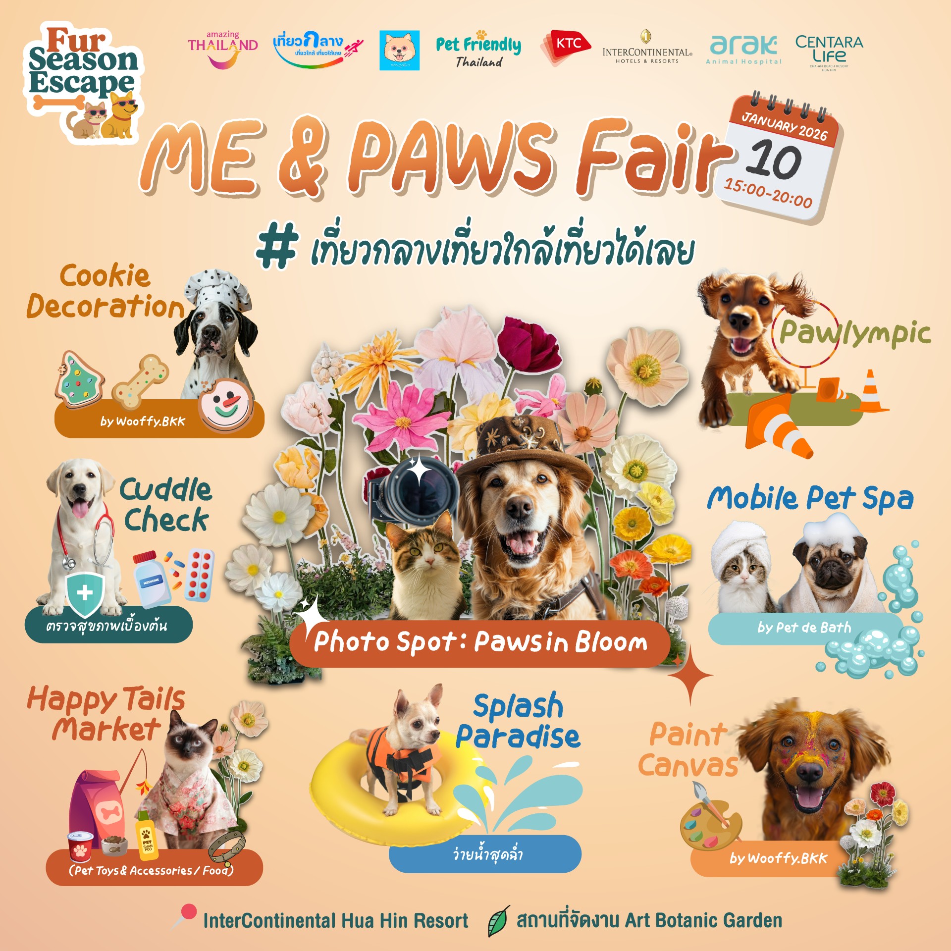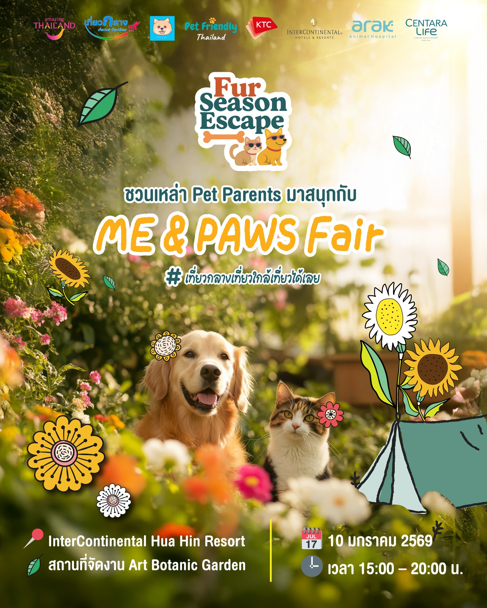 นอกจากนี้ ททท. ยังได้ต่อยอดประสบการณ์อย่างต่อเนื่องด้วยการจัดงานME & PAWS Fair ในวันเสาร์ที่ 10 มกราคม 2569 ณ Art Botanic Garden, InterContinental Hua Hin Resort By IHG อำเภอหัวหิน จังหวัดประจวบคีรีขันธ์ ภายใต้บรรยากาศ Paws in Bloom ชวนเหล่า Pet Parent และคุณหนูตูบ & เหมียว ทุก ๆ บ้าน มาเปิดโหมดชิลล์ เสพฟีลอาร์ตท่ามกลางสวนสวย พร้อมร่วมฟัง Talk Session: Fur Season Escape & Exclusive Privileges รับบริการตรวจสุขภาพสัตว์เลี้ยงเบื้องต้น และสนุกกับกิจกรรม อาทิ Pawlympic, Splash Paradise, Cookie Decoration, Paint Canvas รวมทั้ง Happy Tails Market ให้เลือกช้อปของกิน ของใช้ และของเล่นสำหรับสัตว์เลี้ยงไว้อย่างครบครัน