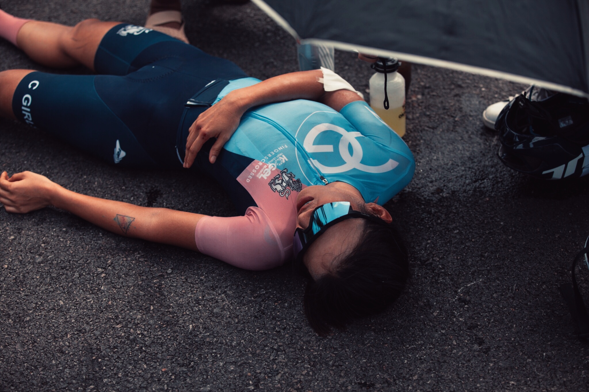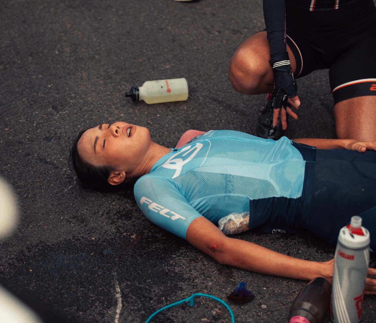 จนพ้นยอดเนิน กิโลเมตรที่ 53 ผู้ชายรุ่น 50 เกิดผิดจังหวะล้ม แล้วเกี่ยวคนด้านข้างและด้านหลังล้มกันทั้งหมด รวมทั้งมิ้นท์ด้วย ซึ่งมิ้นท์เองตอนนั้นจำได้ว่าเห็นเหตุการณ์ ฝรั่งผู้ชายขาหลุดจากบันไดปั่น เซไปชนคันข้างๆแล้วมิ้นท์ตามหลัง มิ้นท์ตั้งสติจะหักหลบขวา แต่ทุกอย่างเกิดขึ้นไวมาก เพียงเสี้ยววินาที มิ้นท์โดนเกี่ยวล้มลงไปกับพื้นถนนด้วย หัวฟาดพื้น หมวกกันน็อคร้าว รู้สึกตอนนั้นรู้แต่ว่าเหมือนตัวเองเจ็บไปทุกส่วนแล้วก็จำอะไรไม่ค่อยได้อีกเลย…..