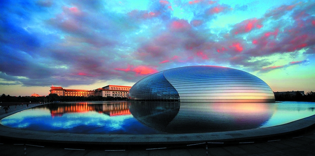 โรงละครแห่งชาติ โรงละครหลังใหม่กลางกรุงปักกิ่ง ตั้งอยู่ติดกับมหาศาลาสมาคมและใกล้กับ จัตุรัสเทียนอันเหมิน มีขนาด 200,000 ตารางเมตร จุคนได้ 6,500 คน ลักษณะเป็นรูปทรงคล้ายไข่ ภายในประกอบด้วยโรงโอเปรา ห้องแสดงคอนเสิร์ต และโรงละคร ล้อมรอบอาคารด้วยทะเลสาบที่สร้างขึ้น โดยทางเข้าหลักเจาะเป็นอุโมงค์ลอดใต้ทะเลสาบจำลอง ทางการจีนทุ่มงบประมาณก่อสร้างมากกว่า 12,000 ล้านบาท