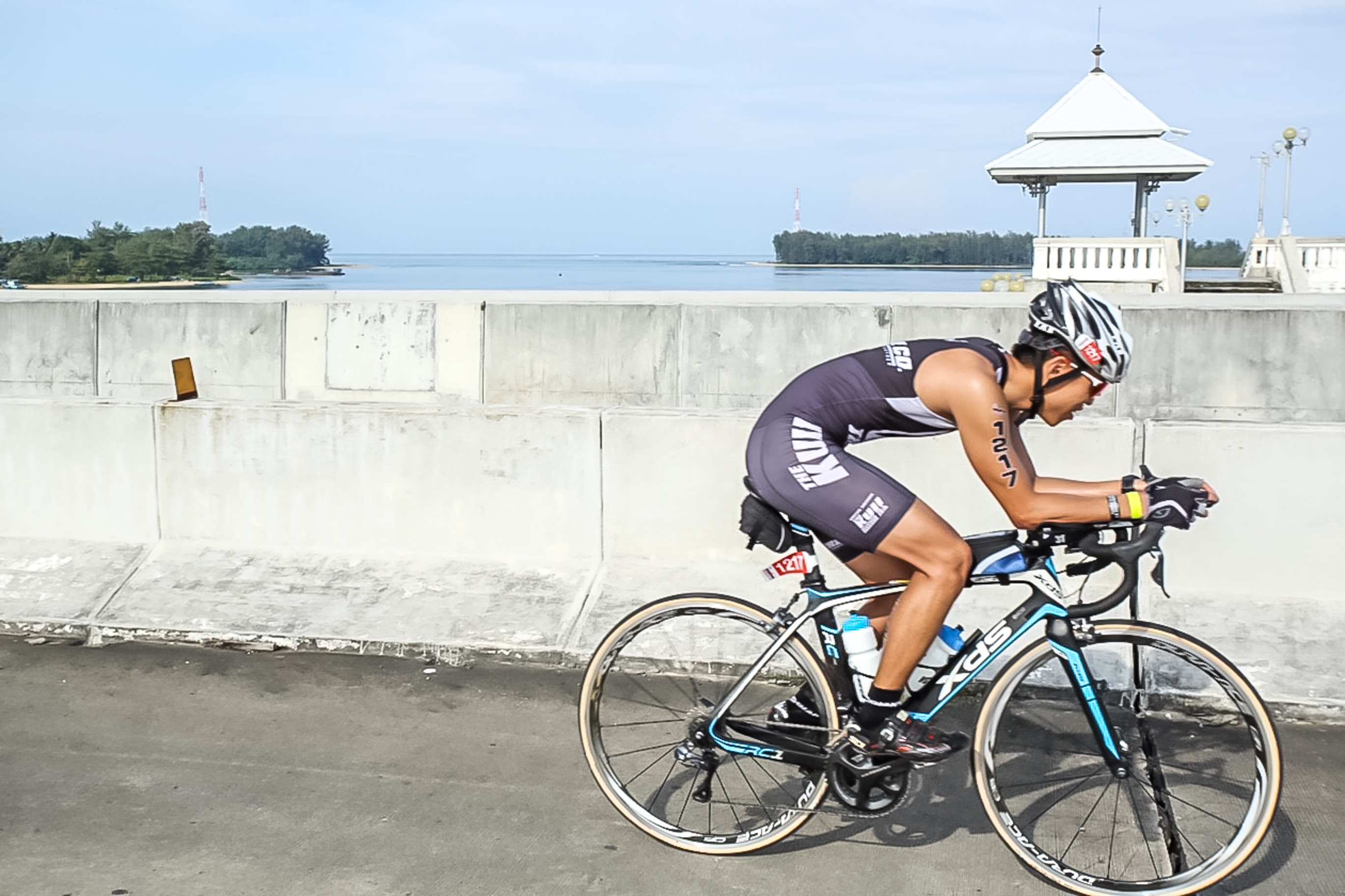 ความรู้สึกหลังขึ้นจากน้ำก็ไม่ต่างจากการยกภูเขาทั้งลูกออกจากอก ผมเดินเข้าจุด Transition ค่อย ๆ ล้างน้ำทะเลจากมือให้สะอาดพอที่จะใส่คอนเทคเลนส์สายตาสั้นเพื่อใส่แว่นกันแดด ผมใช้เวลาที่ Transition ประมาณ 8นาที เพื่อกินกล้วยตากและขนมปังเพิ่มพลังแล้วจึงออกไปปั่นจักรยาน ระยะทางปั่นจักรยาน 90 กิโลเมตรเต็มไปด้วยรอยยิ้มบนใบหน้า วิวสวยสะดุดตาเพราะความสุขมาจากความรู้สึกโล่งในจิตใจ ระหว่างทางปั่นจักรยานบนเกาะภูเก็ตจากลากูน่ามุ่งหน้าไปกลับตัวที่สะพานสารสินมีจุดที่ต้องจอดจักรยานแบกขึ้นสะพานลอย