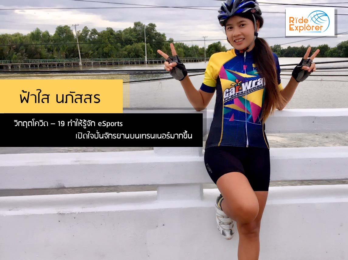 - เมื่อเกิดวิกฤตโควิด-19 ทำให้เริ่มรู้จัก eSports มากขึ้น โดยปกติฟ้าจะเป็นคนไม่ชอบขึ้นเทรนเนอร์ เพราะต้องปั่นอยู่กับที่แบบไม่มีไรให้เราได้ดูเลยค่ะ ส่วนใหญ่เวลาปั่น จะออกไปปั่นข้างนอกมากกว่า เพราะรู้สึกว่ามันไม่น่าเบื่อ เพราะได้เจอเพื่อน ได้ออกมาสูดอากาศข้างนอก แต่เมื่อเกิดวิกฤตโควิด-19 ขึ้นในครั้งนี้ ทำให้ฟ้าเริ่มมาสนใจเกี่ยวกับการปั่นอยู่ที่บ้านมากขึ้น โดยเริ่มศึกษาว่า อุปกรณ์ในการใช้ปั่นจักรยานมีอะไรบ้าง และได้สอบถามเพื่อนๆ ที่เขาเคยปั่น รู้สึกอย่างไรบ้าง และพอฟ้าได้มีโอกาสได้ลองปั่นในครั้งแรก ก็ มีความรู้สึกชอบโดยทันที เพราะปกติตอนเช้าก็จะไม่ค่อยมีเวลามากต้องรีบออกไปทำงาน แล้วตอนเย็นถึงจะได้ปั่น แต่พอได้รู้จัก eSports มากขึ้นก็ทำให้เราเป็นคนมีเวลามากขึ้น ตอนเช้าเริ่มมีเวลาปั่นมากขึ้น และอีกข้อที่เป็นข้อดีคือ ปลอดภัยมากค่ะปกติจะเป็นคนกลัวทางโค้งและลงเขา แต่พอได้ปั่นแล้วรู้สึกว่าปลอดภัย ไม่ต้องออกไปเสี่ยงว่าเราจะไปชนใครไหม หรือใครจะมาชนเราไหม และในการปั่นทำให้เราได้รู้จักกับเพื่อนคนไทยและต่างชาติที่ชื่นชอบกีฬาประเภทนี้มากขึ้น สรุปคือตกหลุมรักตั้งแรกที่ได้ลองค่ะ