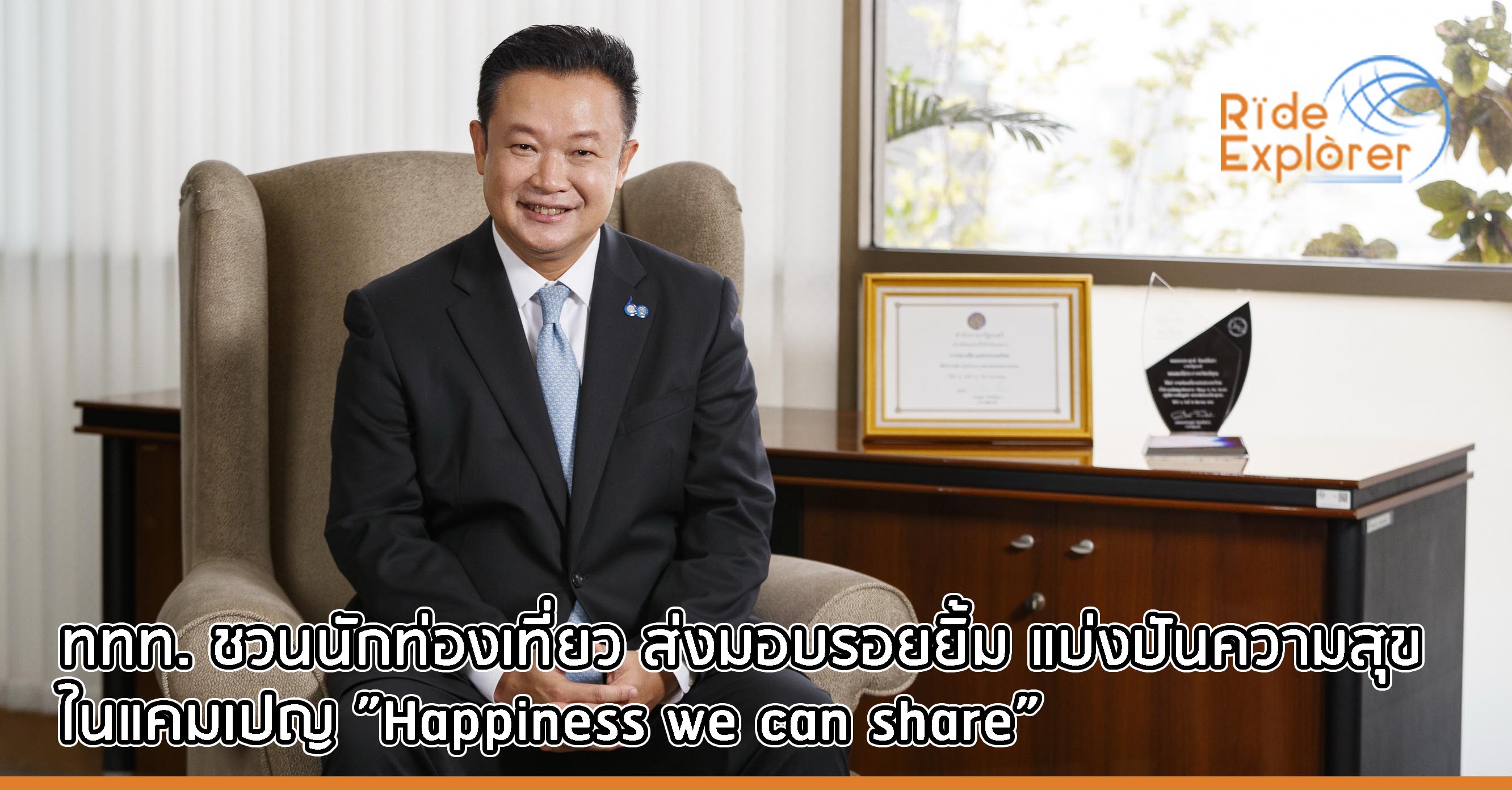 การท่องเที่ยวแห่งประเทศไทย (ททท.) ร่วมกับ สายการบินไทยสมายล์ สายการบินนกแอร์ สายการบินแอร์เอเชีย พร้อมพันธมิตรท่องเที่ยว ร่วมจัดกิจกรรม “Happiness we can share” 60 เส้นทางความสุขและการแบ่งปัน ชวนนักท่องเที่ยวออกเดินทางเพื่อส่งมอบรอยยิ้ม แบ่งปันความสุข กับ 38 กิจกรรมอาสาสมัคร และ 22 ชุมชนท่องเที่ยว ทั่วประเทศไทย พร้อมโปรโมชั่นบัตรโดยสาร ที่พัก รถเช่า และอื่น ๆในราคาสุดพิเศษ