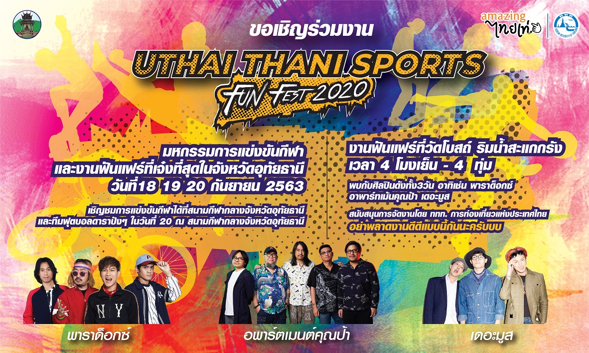 แล้วพบกับกับงาน “Uthai Thani Sports Fun Fest 2020” ณ สนามกีฬาจังหวัด และลานสะแกกรัง อําเภอเมือง จังหวัดอุทัยธานี ในวันที่ 18 – 20 กันยายน 2563 เวลา 4 โมงเย็น – 4 ทุ่ม อย่าพลาดกับงานดีๆแบบนี้ สนับสนุนการจัดงานโดย ททท. การท่องเที่ยวแห่งประเทศไทย ติดตามรายละเอียดเพิ่มเติมได้ที่ Uthai Thani Sports Fun Fest www.facebook.com/ UTHAI-THANI-Sports-Fun-Fest- 102333618287028