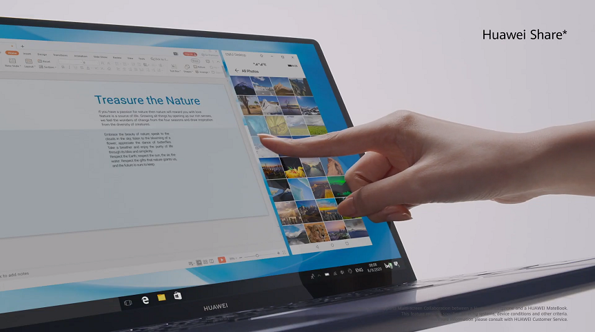 แน่นอนว่า HUAWEI Share ก็เป็นฟังก์ชั่นที่ HUAWEI MateBook 14 ต้องมี เพื่อให้ผู้ใช้ได้ร่วมเป็นส่วนหนึ่งของอีโคซิสเต็มสุดอัจฉริยะที่สามารถรับ-ส่งข้อมูลเอกสาร รูป และวิดีโอ รวมถึงการติดต่อสื่อสารผ่านหลายอุปกรณ์ได้อย่างไร้รอยต่อ โดย HUAWEI MateBook 14 จะสามารถเชื่อมต่อกับสมาร์ทโฟนของหัวเว่ยโดยนำสมาร์ทโฟนไปแตะที่ Touch Pad ของแล็ปท็อป ก็จะสามารถลากข้อมูลจากจอสมาร์ทโฟนที่ปรากฏบนหน้าจอแล็ปท็อป เข้าโปรแกรมบนแล็ปท็อปได้ทันทีแบบ Multi-Screen Collaboration โดยจะสามารถควบคุมข้อมูลบนสมาร์ทโฟนด้วยฮาร์ดแวร์ของแล็ปท็อปได้ด้วย นอกเหนือจากนั้นยังอำนวยความสะดวกในการเข้าเครื่องแบบรวดเร็วแต่ปลอดภัยด้วยปุ่มสแกนลายนิ้วมือ Finger Print Power Button และรักษาความเป็นส่วนตัวด้วยกล้องแบบ Recessed Camera อีกด้วย