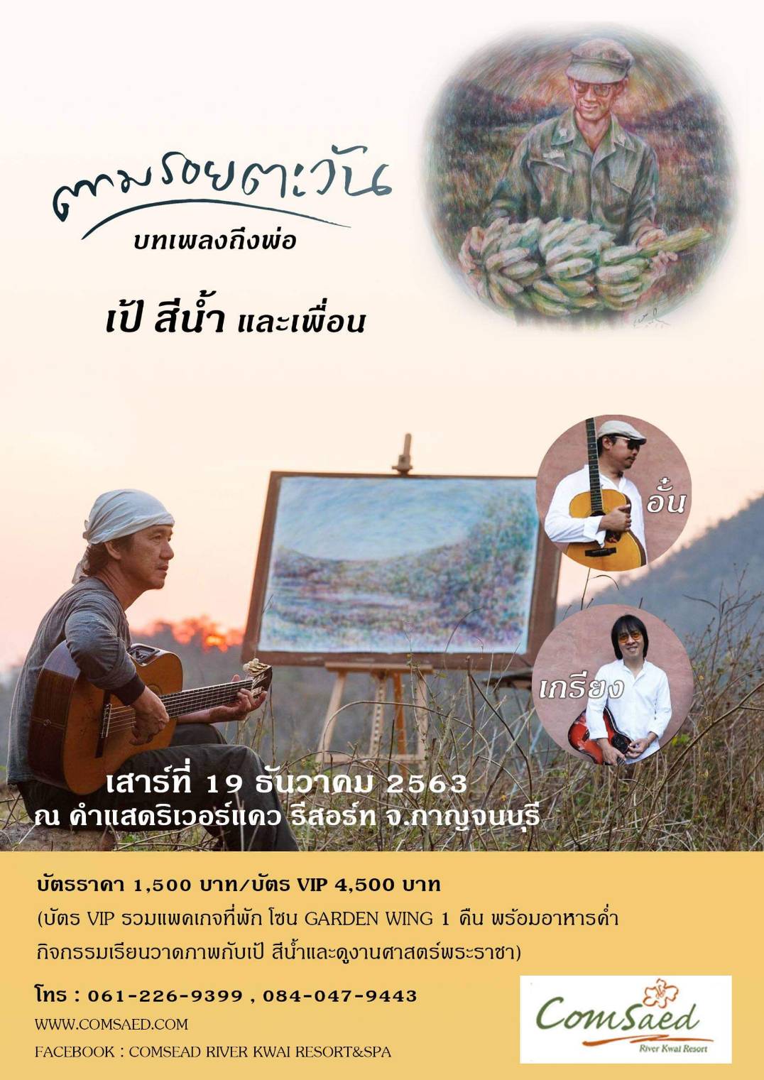 ก้าวสู่ปี 27 “คำแสด ริเวอร์แคว รีสอร์ท” กาญจนบุรี น้อมนำ “ศาสตร์พระราชา” สู่การท่องเที่ยวยั่งยืน สำหรับใครที่เป็นแฟนเพลงของ เป้ สีน้ำ ศิลปิน จิตรกร เจ้าของเพลงรัก สร้างแรงบันดาลใจ กับผลงานที่ยังได้รับความชื่นชมต่อเนื่องกับเพลง ฝากรัก , เจ็บเพื่อเข้าใจ จากเพลงประกอบภาพยนตร์ พันธุ์หมาบ้า พร้อมยังสร้างสรรค์งานเพลงในการอนุรักษ์ธรรมชาติอย่างต่อเนื่อง ในอัลบั้ม The Forest ไม่ว่าจะเป็น ต้นไม้ , ป่าต้นน้ำ , ตำนานสายน้ำ , หิงห้อย รวมถึงผลงานทรงคุณค่า ตามรอยตะวัน , พ่อคือแสงสว่าง , ปรัชญาพอเพียง ที่เป้ สีน้ำ ได้น้อมนำพระราชดำรัส เศรษฐกิจพอเพียง มาใช้ในชีวิตประจำวัน และการรู้จักคุณค่าของการปลูกป่าและการอนุรักษ์ธรรมชาติอย่างยั่งยืน และไม่ควรพลาดกับปรากฏการณ์ทางดนตรีใน Exclusive Concert “ตามรอยตะวัน” โดยเป้ สีน้ำ (Pe Seenam) และเพื่อน โดยมี อั่น ศิริพงษ์ (อั๋น ศิริพงษ์ โพธิศิริ : Aun Siriphong Phosiri ) และเกรียง ไรวิรัตน์ ( Kriangsak Raivirat) จึงเกิดการจุดประกายร่วมกันกับทางทีมผู้บริหารคำแสดริเวอร์แคว รีสอร์ท ผศ. ดร. อรลัชชา ศิวรักษ์ (Asst. Prof. Dr. Ornlatcha Sivarak) ที่มองเห็นคุณค่าในการนำบทเพลงสร้างแรงบันดาลใจของ เป้ สีน้ำ และเพื่อน