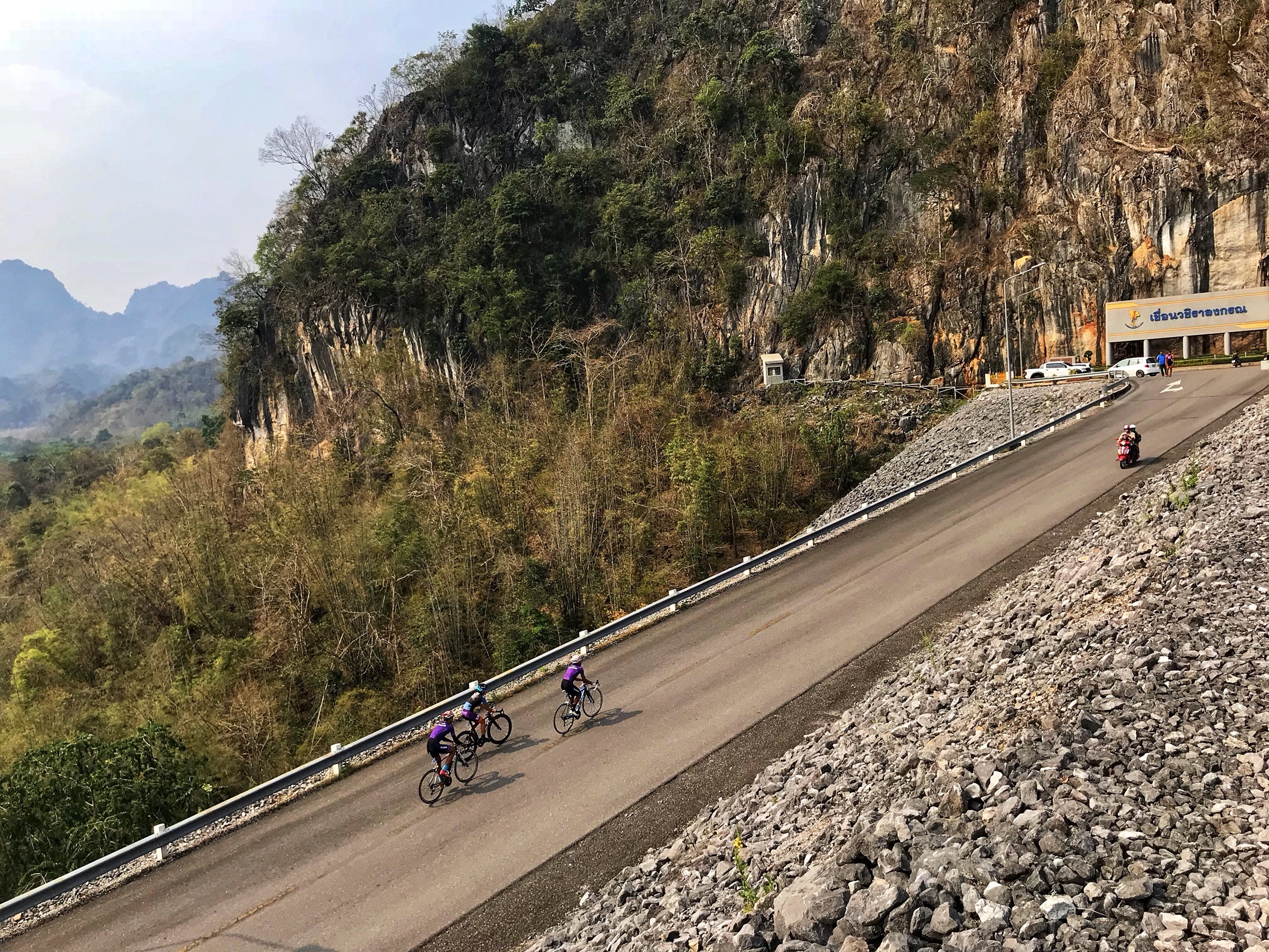 เมื่อเราปั่นมาถึงตีนเขื่อน จะเห็นสันเขื่อนเป็นเนินตรงยาว ประมาณ 3 กิโลเมตร จะมีความชันประมาณ 6-8 % หนืดๆ กำลังดี วันนี้เรามากับเพื่อนๆนักปั่นหลายคน จึงค่อยๆปั่นขึ้น พร้อมกับชมวิวด้านล่างที่สวยมากกกกก