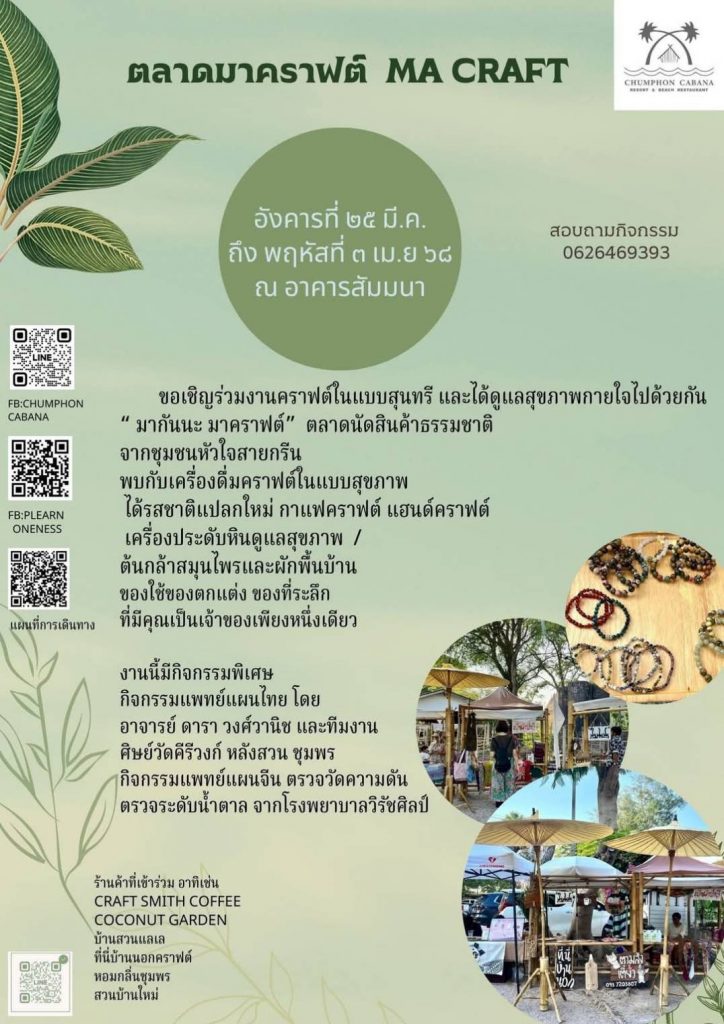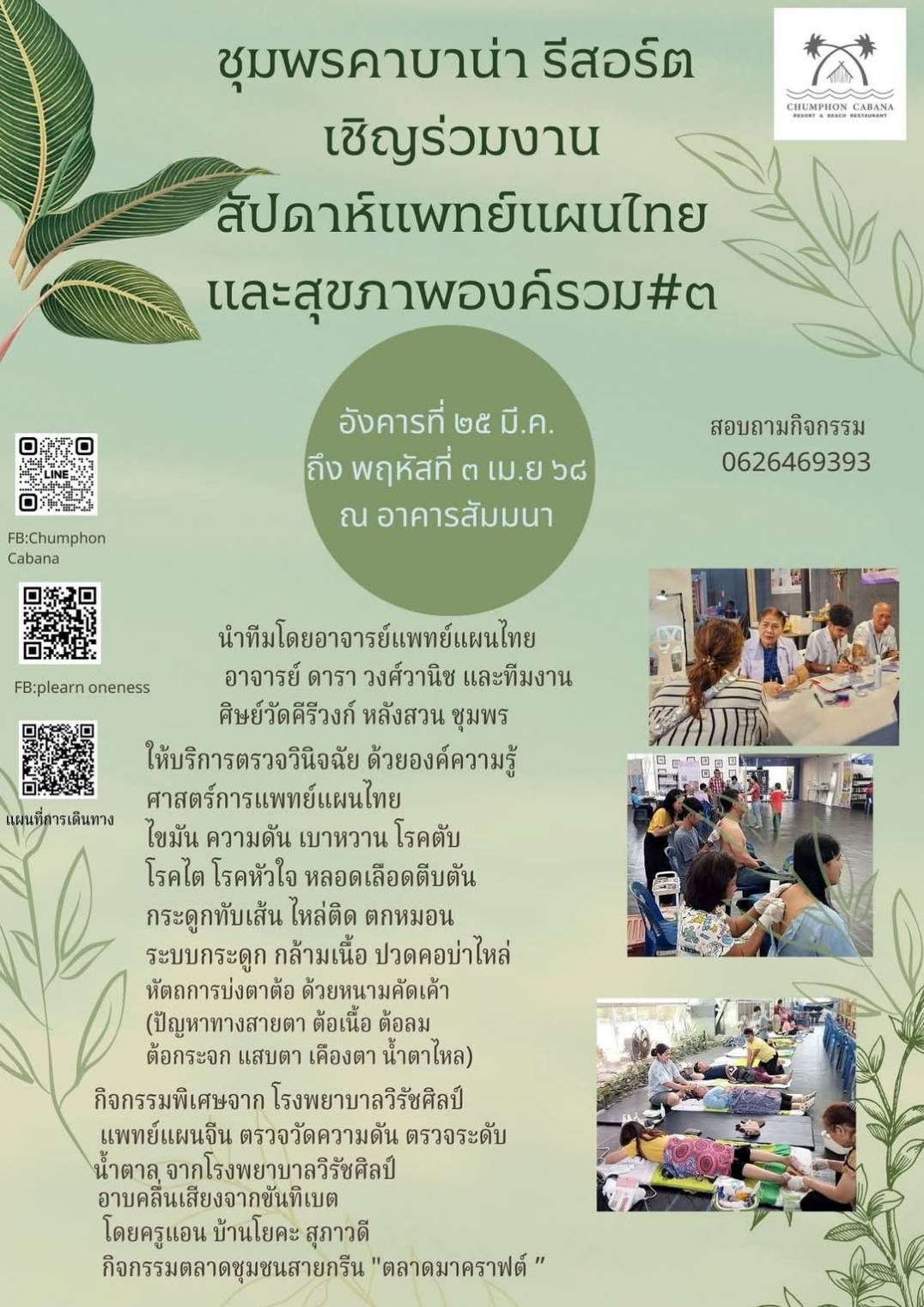 ชุมพร – สุขภาพดีเริ่มต้นที่ตัวคุณ! กลับมาอีกครั้งกับงาน “สัปดาห์แพทย์แผนไทยและสุขภาพองค์รวม ครั้งที่ 3” งานมหกรรมสุขภาพที่รวบรวมศาสตร์การดูแลร่างกายและจิตใจแบบองค์รวม ไม่ว่าจะเป็น แพทย์แผนไทย แพทย์แผนจีน และศาสตร์ทางเลือกต่างๆ พร้อมกับตลาดสีเขียว “ตลาดมาคราฟต์” ที่รวมผลิตภัณฑ์ออร์แกนิกและสินค้าทำมือจากท้องถิ่น จัดขึ้นระหว่างวันที่ 25 มีนาคม – 3 เมษายน 2568 ตั้งแต่เวลา 09.00 – 16.00 น. ณ อาคารสัมมนา ชุมพรคาบาน่า รีสอร์ต