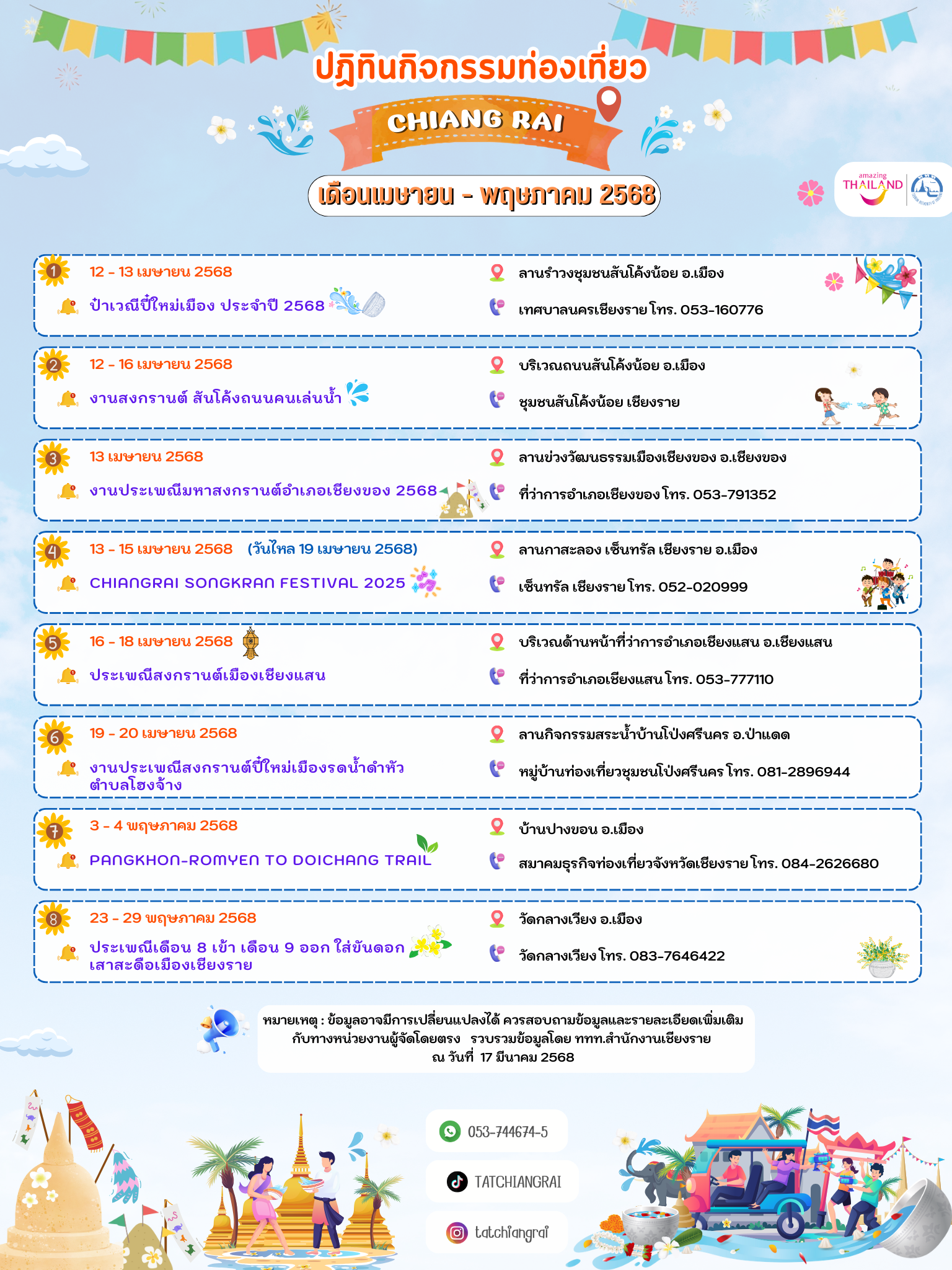 ททท.สำนักงานเชียงราย จึงขอเชิญชวนนักท่องเที่ยวทุกท่าน เดินทางมาท่องเที่ยวในพื้นที่จังหวัดเชียงราย-พะเยา เพื่อสืบสานงานประเพณีสงกรานต์ ปี๋ใหม่เมืองเชียงราย-พะเยา ตลอดเดือนเมษายน 2568 และร่วมกิจกรรมงานประเพณีต่างๆ ในช่วงพฤษภาคม 2568 นี้ สอบถามรายละเอียดเพิ่มเติมได้จากหน่วยงานจัดงานประเพณีในตารางแนบท้ายนี้ และ ททท.สำนักงานเชียงราย โทร. 0 5371 7433, 0 5374 4674-5 , ศูนย์ประสานงานการท่องเที่ยวจังหวัดพะเยา (ททท.) โทร. 054 430400, 054-430401หรือ TAT Call Center โทร. 1672 เบอร์เดียวเที่ยวทั่วไทย ค้นหาแหล่งท่องเที่ยวจังหวัดเขียงรายได้ที่เว็บไซต์ www.tourismchiangrai-phayao.com, เพจ Facebook : ททท.สำนักงานเชียงราย, เพจ Facebook : ศูนย์ประสานงานการท่องเที่ยวจังหวัดพะเยา(ททท.)