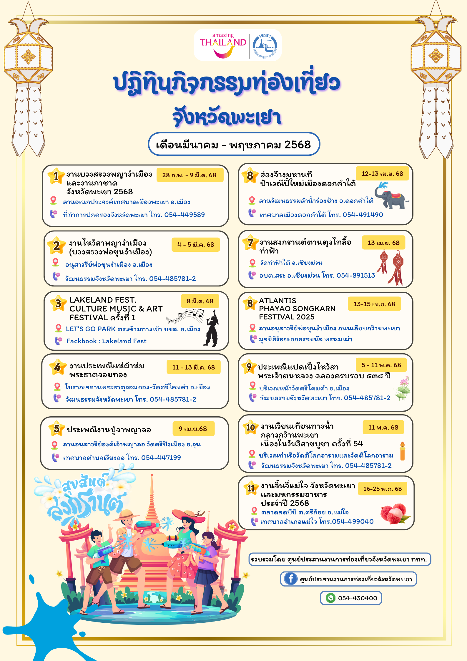 จังหวัดพะเยา ททท.สำนักงานเชียงรายและศูนย์ประสานงานการท่องเที่ยวจังหวัดพะเยา(ททท.) ร่วมกับวัดศรีโคมคำ พระอารามหลวง จัดกิจกรรม “สงกรานต์ตานตุง ไหว้สาบูชาพระเจ้าตนหลวง” ขึ้น ในระหว่างวันที่ 1-30 เมษายน 2568 ณ วัดศรีโคมคำ พระอารามหลวง อ.เมือง จังหวัดพะเยา จึงขอเชิญชวนนักท่องเที่ยวทุกท่านมาร่วมทำบุญไหว้พระขอพร และสัมผัสประสบการณ์สุดพิเศษในช่วงเทศกาลสงกรานต์นี้ มีกิจกรรมภายในงานมากมาย อาทิเช่น สรงน้ำองค์พระเจ้าตนหลวง, แขวนตุงวันเกิดบูชาไหว้สาพระเจ้าตนหลวง ๑,๐๐๐ ผืน บริเวณด้านหน้าวิหารหลวง, ร่วมกิจกรรมขนทรายเข้าวัด, ปักตุงเจดีย์ทรายสุดส้าว และเจดีย์ทรายประจำปีเกิด 12 นักษัตร และร่วมเป็นส่วนหนึ่งในการประดิษฐ์ ตานตุง (ตุงบูชา) เพื่อเป็นพุทธบูชาไหว้พระขอพร พระเจ้าตนหลวง พระพุทธรูปศักดิ์สิทธิ์สำคัญของจังหวัดพะเยา โดยชาวพะเยาและชาวล้านนาเชื่อว่า การปักตุงและการไหว้บูชาพระเจ้าตนหลวงจะช่วยเสริมสิริมงคลให้กับชีวิต นอกจากนี้ ในพื้นที่อำเภอเมืองจังหวัดพะเยา จัดงาน “คอนเสิร์ตสงกรานต์ เมืองกว๊านพะเยา” (ATLANTIS PHAYAO SONGKARN FESTIVAL 2025)ระหว่างวันที่ 13-15 เมษายน 2568 ณ ลานอนุสาวรีย์พ่อขุนงำเมือง อ.เมือง จ.พะเยา โดยมูลนิธิธรรมนัส พรหมเผ่า , ในอำเภอดอกคำใต้ เทศบาลเมืองดอกคำใต้ จัดงาน”ประเพณีสงกรานต์ฮ่องจ้างมหานทีป๋าเวณีปี๋ใหม่เมืองดอกคำใต้”ประจำปี 2568 ระหว่างวันที่ 12-13 เมษายน 2568 ณ ลานวัฒนธรรมลำน้ำร่องช้าง อ.ดอกคำใต้ และ องค์การบริหารส่วนตำบลสระ อ.เชียงม่วน จัดงาน“ประเพณีสงกรานต์ตานตุงไทยลื้อท่าฟ้าใต้” ในวันที่ 13 เมษายน 2568 ณ โบราณสถานวัดท่าฟ้าใต้ อ.เชียงม่วนจังหวัดพะเยา , “ประเพณีงานปู่จาพญาลอ” วันที่ 9 เมษายน 2568 ณ ลานอนุสาวรีย์องค์เจ้าพญาลอ วัดศรีปิงเมือง อ.จุน โดยเทศบาลตำบลเวียงลอ และในช่วงเดือนพฤษภาคม 2568 นี้ มีงาน”ประเพณีแปดเป็งไหว้สาพะเจ้าตนหลวง ฉลองครบรอง 534 ปี” ณ บริเวณด้านหน้าวัดศรีโคมคำ อ.เมือง จ.พะเยา, “งานประเพณีเวียนเทียนทางน้ำกลางกว๊านพะเยาเนื่องในวันวิสาขบูชา ครั้งที่ 54 “ วันที่ 11 พฤษภาคม 2568 ณ บริเวณท่าเรือ/วัดติโลกอาราม และ “งานลิ้นจี่แม่ใจ จังหวัดพะเยาและมหกรรมอาหารประจำปี 2568” ระหว่างวันที่ 16-25 พฤษภาคม 2568 ณ ตลาดสดบีบี ต.ศรีถ้อย อ.แม่ใจ อ.แม่ใจ จ.พะเยา