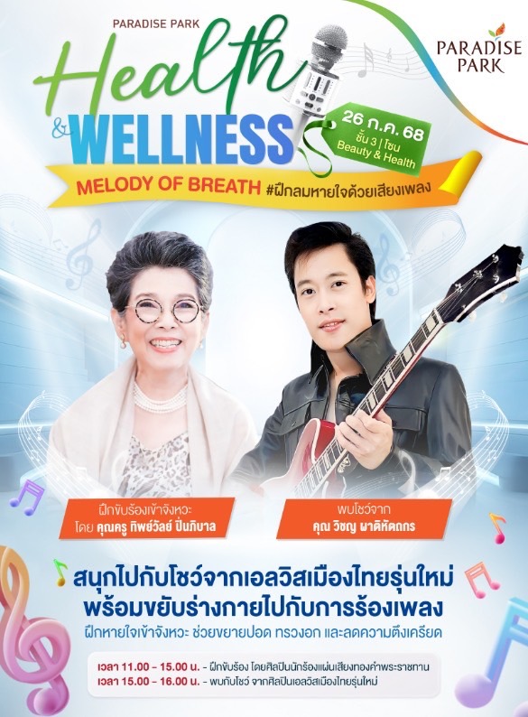 พาราไดซ์ พาร์ค ศูนย์การค้าในเครือเอ็ม บี เค ชวนคุณมาสร้างสุขภาพดีทั้งกายและใจ ในงาน Paradise Park Health & Wellness Melody Of Breath #ฝึกลมหายใจด้วยเสียงเพลง ภายในงานพบกับกิจกรรมบำบัดสร้างสุข ผ่านการเคลื่อนไหวของร่างกาย เพื่อปลดปล่อยความคิดและอารมณ์ สร้างสมดุลทั้งทางร่างกายและจิตใจ ด้วยกิจกรรมหลากหลายที่ออกแบบมา เพื่อส่งเสริมสุขภาพ โดยเวลา 13.00 น. – 15.00 น. พบกับ “กิจกรรมฝึกขับร้องเพลงเข้าจังหวะ” นำโดย คุณครูทิพย์วัลย์ ปิ่นภิบาล นักร้องแผ่นเสียงทองคำพระราชทาน ถ่ายทอดเทคนิคการฝึกลมหายใจผ่านการขับร้อง ที่ช่วยขยายทรวงอกและปอด เหมาะอย่างยิ่งสำหรับผู้สูงอายุ ช่วยให้รับออกซิเจนได้เต็มที่ ส่งผลให้สุขภาพแข็งแรงและอายุยืนยาว และเวลา 15.00 – 16.00 น. สนุกกับโชว์พิเศษจาก “เอลวิสเมืองไทยรุ่นใหม่” โดย คุณวิชญ ผาติหัตถกร ที่จะมาร่วมสร้างสีสันผ่านการร้องเพลง เต้นรำ และสร้างความสุขให้ผู้ร่วมงานทุกท่าน