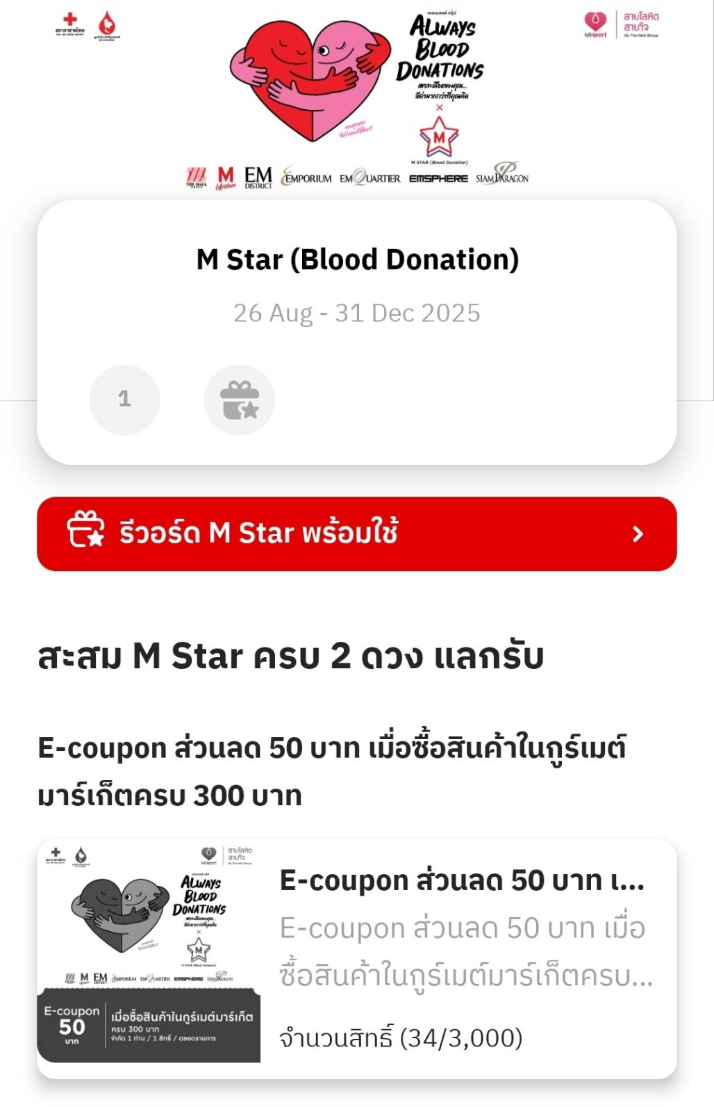 ด้วยการพัฒนาแคมเปญ M STAR Blood Donation รณรงค์ผู้มีจิตศรัทธา สร้างกุศลด้วยการบริจาคโลหิตต่อเนื่องทุกๆ 3 เดือน และสะสมคะแนนความดีผ่านแอปพลิเคชัน M Card โดยทุกๆครั้งของการบริจาคโลหิตสามารถสะสม M STAR ได้ 1 ดวง สะสมครบ 2 ดวงแลกรับคูปองส่วนลด 50 บาท ในกูร์เมต์มาร์เก็ต เมื่อซื้อสินค้าครบ 300 บาท (จำกัด 3,000 สิทธิ์) สะสมครบ 3 ดวง แลกรับคูปองส่วนลด 200 บาท ที่ห้างสรรพสินค้าในเครือเดอะมอลล์ กรุ๊ป เมื่อซื้อสินค้าครบ 1,000 บาท (จำกัด 500 สิทธิ์) และพิเศษเฉพาะภายในงาน สำหรับสมาชิก M CARD ที่ร่วมบริจาคโลหิต รับ CASH COUPON 100.- สำหรับใช้จ่ายร้านค้า DINING / LIFESTYLE ในศูนย์การค้าที่ร่วมรายการ (ยอดใช้จ่ายขั้นต่ำ 500.- / ใบเสร็จ) จำกัด 1 สิทธิ์ / 1 ใบเสร็จ / 1 หมายเลขสมาชิก M CARD / วัน จำกัดรวม 500 สิทธิ์ / ตลอดรายการ คูปองแทนเงินสดศูนย์การค้าหมดอายุ วันที่ 30 กันยายน 2568