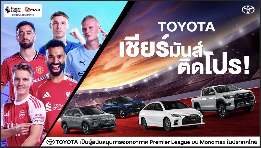 บริษัท โตโยต้า มอเตอร์ ประเทศไทย จำกัด ร่วมมือกับ บริษัท โมโนสตรีมมิ่ง จำกัด หรือ Monomax แพลตฟอร์มหลักในการถ่ายทอดสดพรีเมียร์ลีก และ บริษัท จัสมิน อินเตอร์เนชั่นแนล จำกัด (มหาชน) หรือ JAS ผู้ถือลิขสิทธิ์การถ่ายทอดสดฟุตบอลพรีเมียร์ลีก และ เอมิเรตส์ เอฟเอ คัพ อย่างเต็มรูปแบบในประเทศไทย ผนึกกำลังขับเคลื่อนประสบการณ์การรับชมฟุตบอลของชาวไทยไปสู่อีกระดับ โดยการเป็นผู้สนับสนุนการออกอากาศ Premier League บน Monomax อย่างเป็นทางการ พร้อมเปิดตัวแคมเปญใหญ่ ‘เชียร์มันส์ ติดโปร’ มอบสิทธิพิเศษมูลค่ากว่า 10 ล้านบาทตลอดฤดูกาล 2025/26