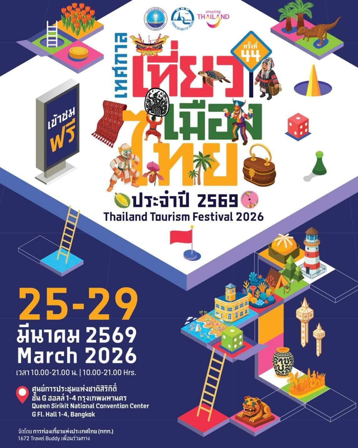 ททท.ขอเชิญชวนนักท่องเที่ยวและประชาชนทั่วไปร่วมสัมผัสเสน่ห์ของการท่องเที่ยวไทยแบบครบทุกมิติ และค้นพบความสุขและแรงบันดาลใจในการออกเดินทางท่องเที่ยวไทยไปด้วยกัน สำหรับผู้ที่สนใจสามารถเข้าร่วมงาน “เทศกาลเที่ยวเมืองไทย ครั้งที่ 44 ประจำปี 2569” ระหว่างวันที่ 25–29 มีนาคม 2569 ณ ศูนย์การประชุมแห่งชาติสิริกิติ์ เข้าร่วมงานฟรี โดยสามารถใช้บริการขนส่งสาธารณะ ได้แก่ รถไฟฟ้า MRT สถานีศูนย์การประชุมแห่งชาติสิริกิติ์, เดินทางโดยรถแท็กซี่ ณ จุดบริการ รับ – ส่ง ชั้น G บริเวณฝั่งทะเลสาบ, รถประจำทาง สาย 136 ทั้งนี้สามารถสอบถามข้อมูลเพิ่มเติมได้ที่ TAT Contact Center โทร. 1672 Travel Buddy