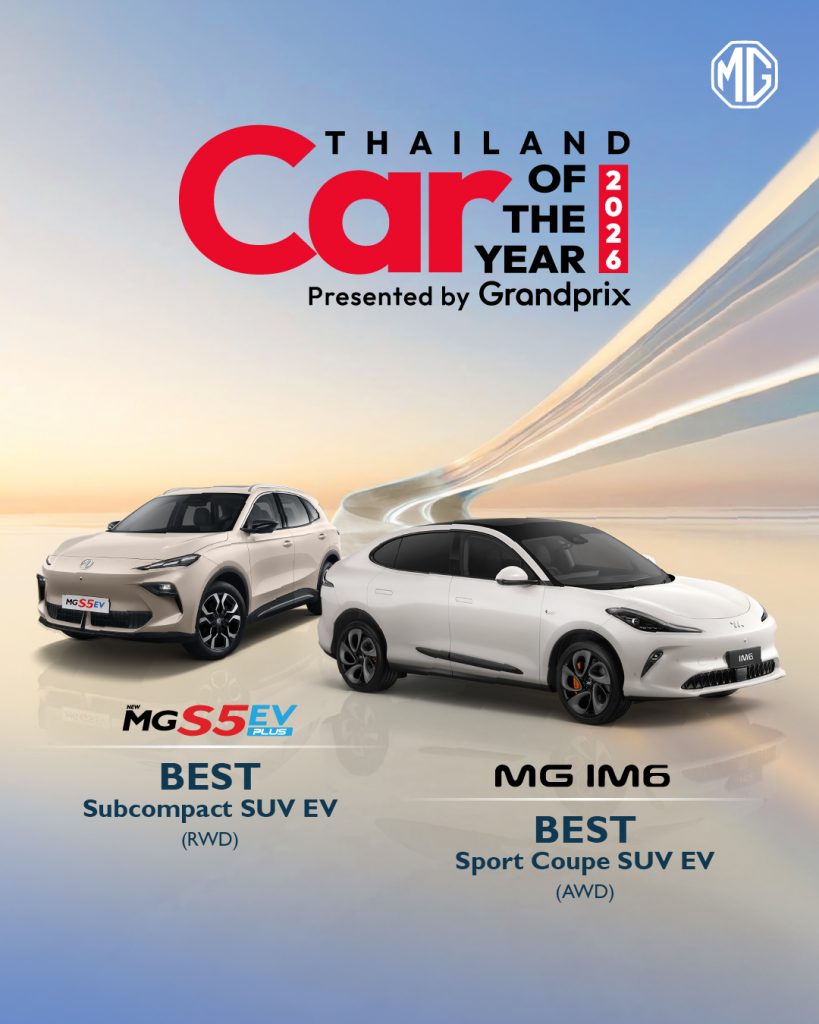 ทั้งนี้ เอ็มจี ได้รับรางวัล THAILAND’S MOST ADMIRED BRAND 2026 ในกลุ่มรถยนต์ไฟฟ้า (EV Car) ซึ่งรางวัลดังกล่าวมาจากผลสำรวจจากประชาชนทั่วทุกภูมิภาคของประเทศไทย สะท้อนถึงการเป็นแบรนด์ที่ได้รับการยอมรับและเชื่อมั่นจากผู้บริโภค นอกจากนี้ ยังสามารถคว้าอีก 2 รางวัลจาก THAILAND CAR OF THE YEAR 2026 กับยนตรกรรม 2 รุ่น โดย MG IM6 ซึ่งเป็น “The First ever Premium Intelligent e-SUV” ที่มาพร้อมเทคโนโลยีอัจฉริยะ ได้รับรางวัล BEST SPORT COUPE SUV EV (AWD) และ NEW MG S5 EV PLUS อีวีมหาชน กับจุดเด่น “ขับดี วิ่งไกล ชาร์จไว นั่งสบาย มี LIFETIME WARRANTY” ได้รับรางวัล BEST SUBCOMPACT SUV EV (RWD)